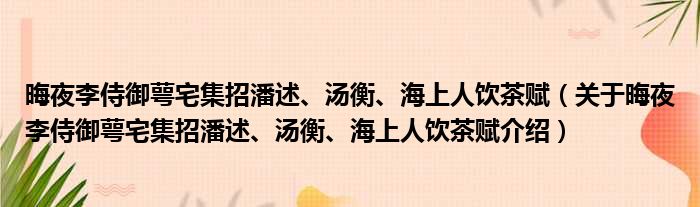 1、 《晦夜李侍御萼宅集招潘述、汤衡、海上人饮茶赋》是唐代皎然创作的一首五言律诗。