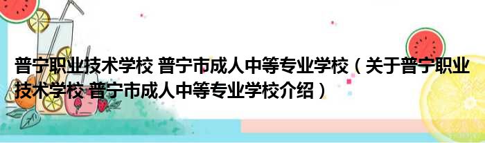 1、 普宁职业技术学校(普宁市成人中等专业学校),创办于1992年,由著名实业家、旅泰侨领张锦程捐资兴建,现是国家级重点职业学校、国家改革发展示范学校、全国教育系统先进集体,是隶属于普宁市政府的副处级单位。