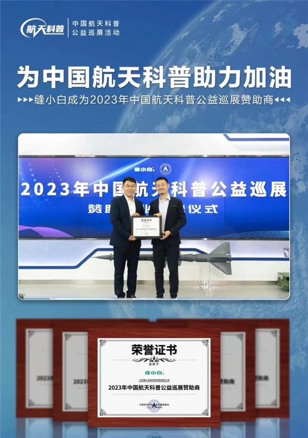 经过层层严审,2023年4月,“缝小白”正式成为2023年中国航天科普公益巡展赞助商,江苏缝小白新材料科技有限公司董事长袁超受邀到航天大院参加赞助企业授牌仪式。