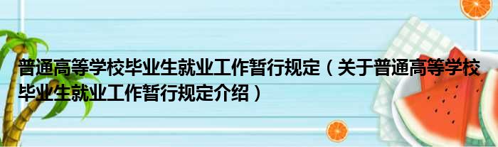 1、 《普通高等学校毕业生就业工作暂行规定》是为做好普通高等学校(含研究生培养单位)毕业生(含毕业研究生)就业工作,更好地为经济建设和社会发展服务,维护毕业生和用人单位的合法权益,根据国家的有关法律和政策制定。