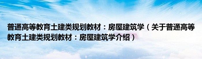 1、 叶雁冰、刘克难主编的《房屋建筑学》根据非建筑学专业学生对建筑知识的需求,全面系统地介绍了大量民用性建筑及工业厂房的建筑设计和建筑构造的基本原理和基本方法,介绍了最新建筑规范和规程对建筑设计和构造的要求,增加了新材料、新技术、新工艺和新构造的内容。