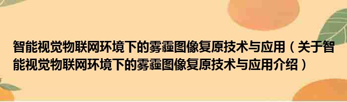 大家好,小钱来为大家解答以上的问题。智能视觉物联网环境下的雾霾图像复原技术与应用,关于智能视觉物联网环境下的雾霾图像复原技术与应用介绍这个很多人还不知道,现在让我们一起来看看吧!