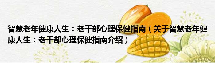 1、 《智慧老年健康人生:老干部心理保健指南》是首都医科大学附属北京安定医院的数位心理学专家结合自己多年的临床经验编写的。