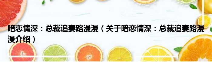 大家好,小钱来为大家解答以上的问题。暗恋情深:总裁追妻路漫漫,关于暗恋情深:总裁追妻路漫漫介绍这个很多人还不知道,现在让我们一起来看看吧!