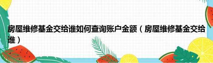 大家好,今天小六子来为大家解答以下的问题,关于房屋维修基金交给谁如何查询账户金额,房屋维修基金交给谁这个很多人还不知道,现在让我们一起来看看吧!