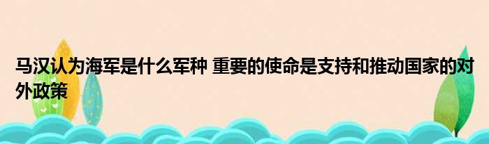 马汉认为海军是(国际性)军种,重要的使命是支持和推动国家的对外政策。马汉认为海军是(战略性)军种,重要的使命是支持和推动国家的对外政策。 马汉在历史上第一次将海洋和海军的作用地位提高到全球战略的高度,从而形成了海权论。直至今天,强大的海权仍是美国全球战略的基础。