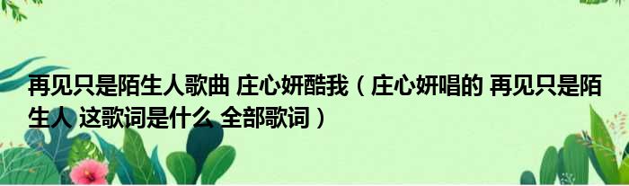 1、歌名:再见只是陌生人演唱:庄心妍作词:林华勇,赖剑亮作曲:林华勇,李帅爱过你就当你是错的人有些错我们都要负责任是否我爱了不该爱的人其实我想要的并不过分爱过你至少我坦诚承认有些错我们不用去争论也许我错过幸福的时分这座城多了个伤心的人我们爱的难舍难分爱的奋不顾身为何再见只是陌生人夜来得无声我的心好冷那绝望比分手更伤人我们爱的难舍难分爱的奋不顾身爱到最后同样不可能你走得无痕我的心好疼该拿什么与眼泪抗衡爱过你至少我坦诚承认有些错我们不用去争论也许我错过幸福的时分这座城多了个伤心的人我们爱的难舍难分爱的奋不顾身为何再见只是陌生人夜来得无声我的心好冷那绝望比分手更伤人我们爱的难舍难分爱的奋不顾身爱到最后同样不可能你走得无痕我的心好疼该拿什么与眼泪抗衡你走得无痕我的心好疼该拿什么与眼泪抗衡 扩展资料《 再见只是陌生人》是林华勇、赖剑亮作词,林华勇作曲,庄心妍演唱的歌曲,收录在庄心妍2015年11月5日发行的专辑《放过自己》中。