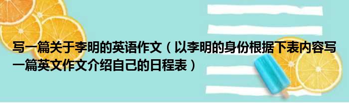 大家好,今天小六子来为大家解答以下的问题,关于写一篇关于李明的英语作文,以李明的身份根据下表内容写一篇英文作文介绍自己的日程表这个很多人还不知道,现在让我们一起来看看吧!