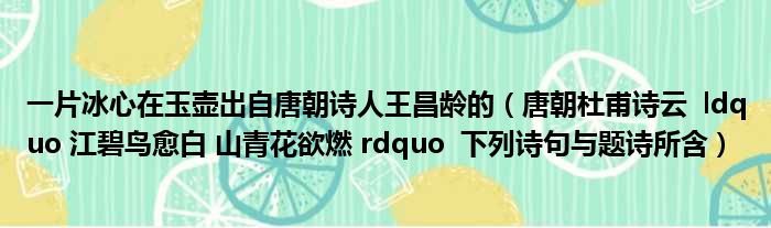 大家好,今天小六子来为大家解答以下的问题,关于一片冰心在玉壶出自唐朝诗人王昌龄的,唐朝杜甫诗云 ldquo 江碧鸟愈白 山青花欲燃 rdquo 下列诗句与题诗所含这个很多人还不知道,现在让我们一起来看看吧!