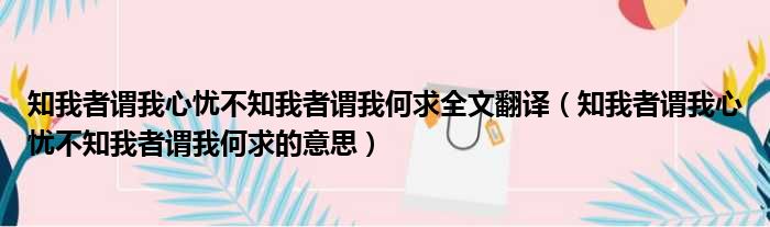 大家好,今天小六子来为大家解答以下的问题,关于知我者谓我心忧不知我者谓我何求全文翻译,知我者谓我心忧不知我者谓我何求的意思这个很多人还不知道,现在让我们一起来看看吧!