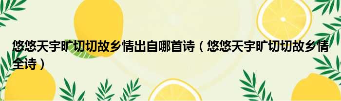 大家好,今天小六子来为大家解答以下的问题,关于悠悠天宇旷切切故乡情出自哪首诗,悠悠天宇旷切切故乡情全诗这个很多人还不知道,现在让我们一起来看看吧!