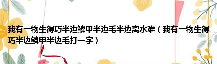 我有一物生得巧半边鳞甲半边毛半边离水难 我有一物生得巧半边鳞甲半边毛打一字 网络整理 经验 2023-06-25 03:35:37 大家好,今天小六子来为大家解答以下的问题,关于我有一物生得巧半边鳞甲半边毛半边离水难,我有一物生得巧半边鳞甲半边毛打一字这个很多人还不知道,现在让我们一起来看看吧!1、鲜。本文分享完毕,希望对你有所帮助。 声明:免责声明:本文来源网友投稿及网络整合仅代表文章作者的个人观点,与本站无关。其原创性、真实性以及文中陈述文字和内容未经本站证实,对本文以及其中全部或者部分内容文字的真实性、完整性和原创性本站不作任何保证或承诺,请读者仅作参考,并自行核实相关内容。投诉邮箱:1765130767@qq.com。 本文地址:https://www.anfu123.com/jingyan/77137.html