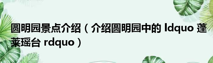 大家好,今天小六子来为大家解答以下的问题,关于圆明园景点介绍,介绍圆明园中的 ldquo 蓬莱瑶台 rdquo这个很多人还不知道,现在让我们一起来看看吧!