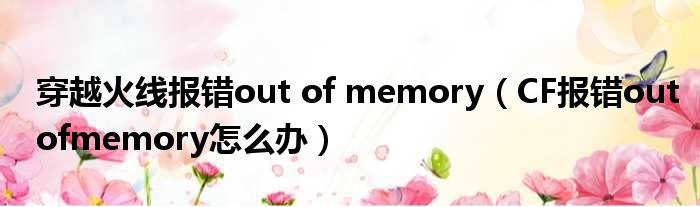 5、 电脑配置低,内存不够大,导致运行CF游戏的时候,出现内存不够; 2、CF游戏客户端程序出现问题,或者版本过低; 3、电脑中开启的应用过多,导致内存占用过多; 问题二:CF out of memory怎么解决? 导致CF出现out of memory主要是因为内存不够导致,如果你电脑在双核、内存4G以上的话,如果出现这种提示,请关闭其他所有打开的应用,运行CF试试,如果问题依旧,那么建议升级一下游戏版本。