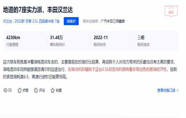 1、油耗低:得益于汉兰达的油电混合动力系统,即使它的重量较大,行驶百公里所产生的油耗也不会很高,官方汉兰达的NEDC油耗为5.3~5.8L,许多车主的实际百公里油耗也在6~8L左右。我认为车辆油耗低,可以很好地降低消费者一部分购买顾虑。