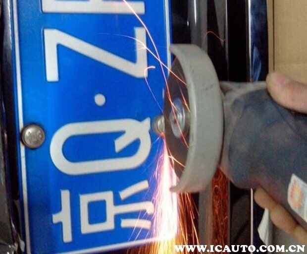 2、插上角磨机电源,然后双手握住角磨机的手柄,右手打开角磨机的开关,将牌照上的螺丝帽用角磨机切一道直口。注意,切的时候一定要稳住,避免把牌照损伤,螺丝帽一共有8个,用角磨机逐一各切一道直口。