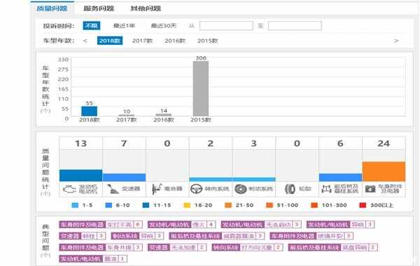 而从中仔细观察也可以发现,主要质量投诉问题集中在车身附件及电器、发动机/电动机上,而2015款的则多了变速器方面的质量问题。至于像玻璃开裂、车灯不亮等情况出现原因比较复杂,最多只能说车辆本身这些东西的质量不是特别好,所以遇到一些磕磕碰碰难免容易故障。