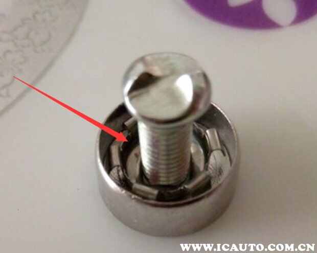 1、把车牌螺丝拿出来,如图将螺丝一边旋转一边插入防盗帽。