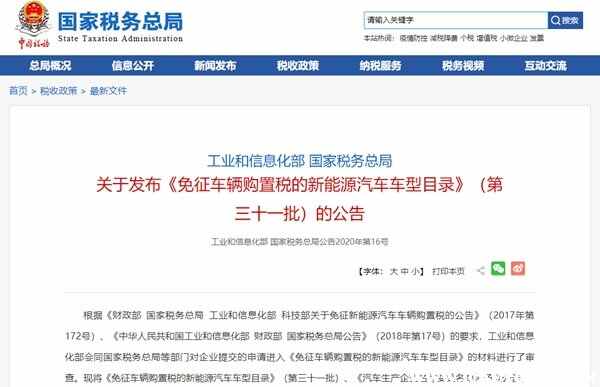 也就是说,现在只要购买《目录》中的新能源车型就可以免交购置税,这个《目录》会在国家税务总局官网不定期地发布和更新,感兴趣的小伙伴们可以前往以下网址进行查询浏览,国家税务总局官网网址:http://www.chinatax.gov.cn