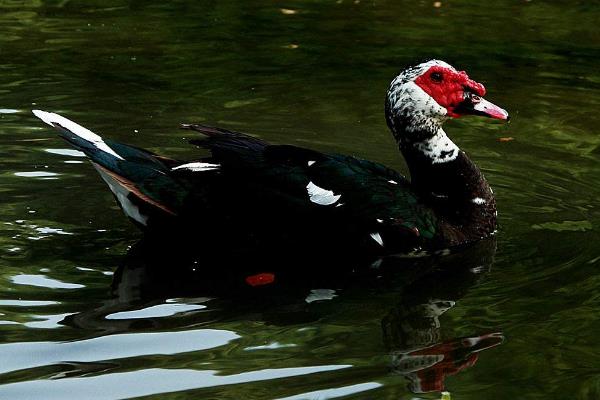 2.黑番鸭的羽毛是黑色的,带有深绿色的光泽;通常只有主翼或复翼的羽毛中才会有一些白色的羽毛;肉瘤的颜色是黑色的,里面有一点红色,而且比较薄;嘴角是红色的,有黑色斑点;彩虹的颜色是浅黄色,脚大部分是黑色的。